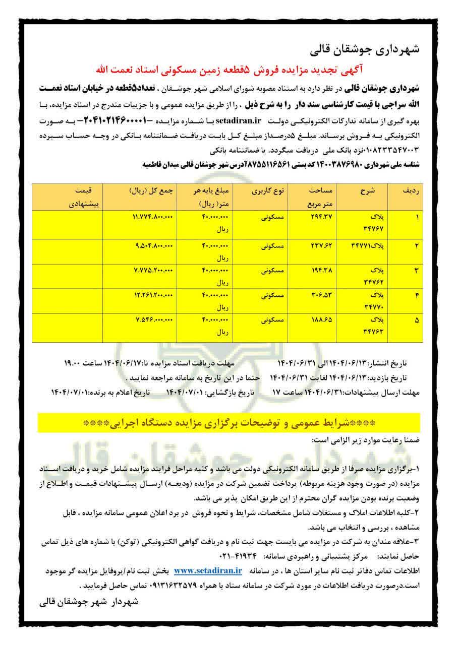 تجدید مزایده فروش زمین — جوشقان قالی، خیابان استاد نعمتالله