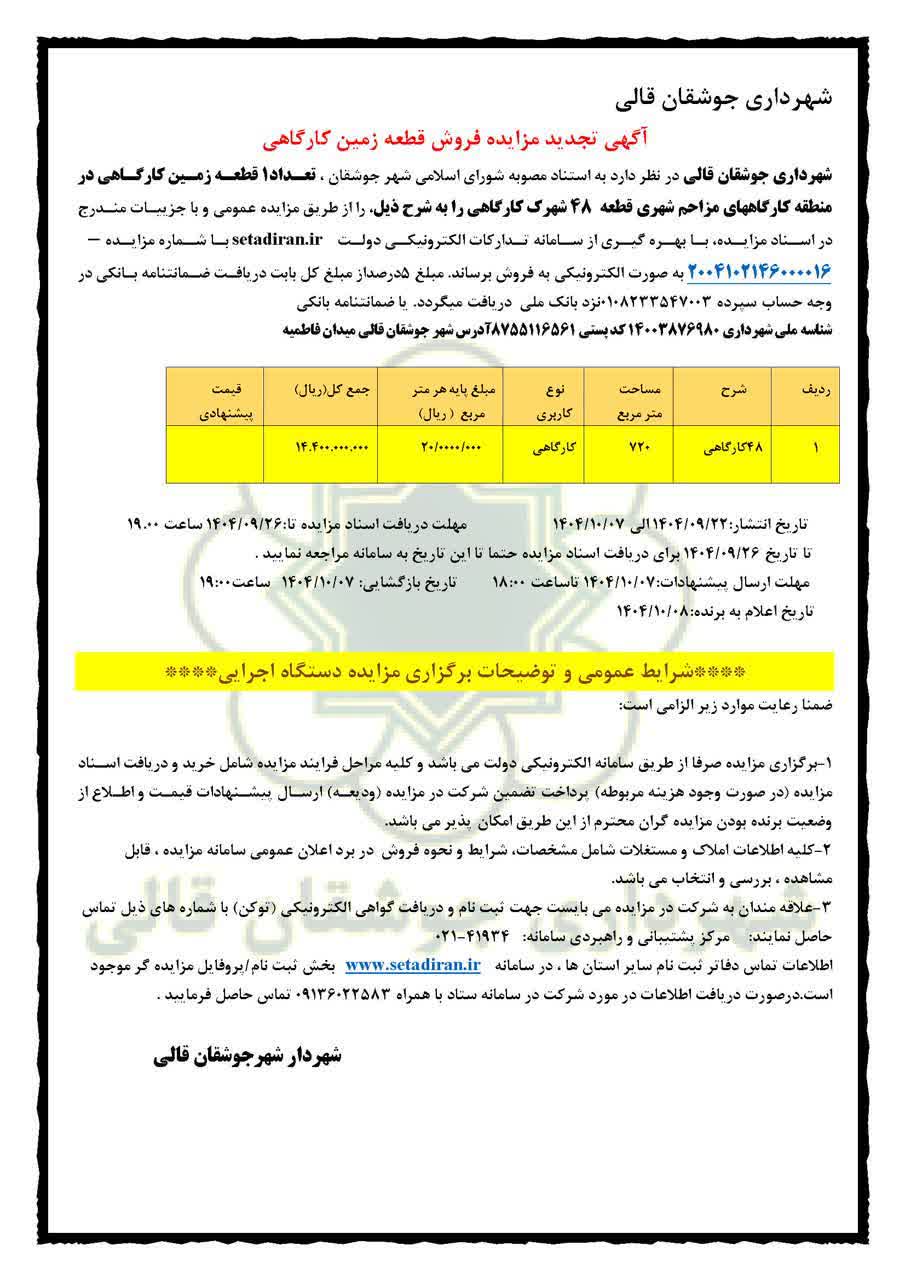 مزایده فروش قطعه زمین ۴۸ شهرک کارگاهیتوسط روابط عمومی شهرداری / آذر 22, 1404 مزایده فروش قطعه زمین ۴۸ شهرک کارگاهی ✍️روابط عمومی شهرداری و شورای اسلامی شهر جوشقان قالی